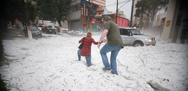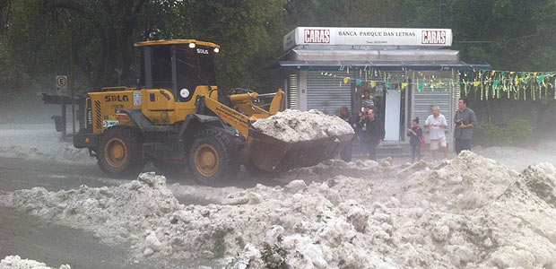 SAN PAOLO - A meno di un mese dalla partita inaugurale dei Mondiali di calcio, San Paolo si sveglia ricoperta di ghiaccio. L'insolito scenario - che ha trasformato la città, completamente imbiancata, in un tipico paesaggio invernale - è stato provocato da una violenta grandinata che nelle ultime ore si è abbattuta sulla zona, facendo precipitare la temperatura da 25 a 16 gradi. Dopo 32 giorni senza pioggia, l'intenso temporale ha causato allagamenti e costretto alla chiusura gli aeroporti. Problemi anche al nuovo stadio della Coppa, inaugurato proprio ieri con la gara tra Corinthians e Figueirense.